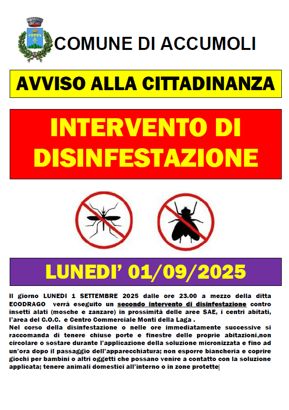 l giorno LUNEDI 1 SETTEMBRE 2025 dalle ore 23.00 a mezzo della ditta ECODRAGO verrà eseguito un secondo intervento di disinfestazione contro insetti alati (mosche e zanzare) in prossimità delle aree SAE, i centri abitati, l’area del C.O.C. e Centro Commerciale Monti della Laga .