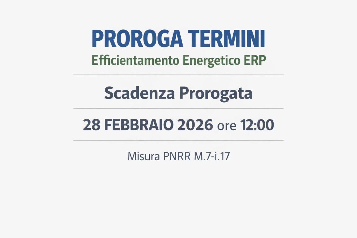 ACER Campania comunica che i termini per la presentazione delle istanze relative all’Avviso pubblico per la raccolta di manifestazioni di interesse e proposte progettuali non vincolanti per interventi di efficientamento energetico su edifici di edilizia residenziale pubblica – Misura PNRR M.7-i.17 sono stati prorogati al 28 febbraio 2026 alle ore 12:00.