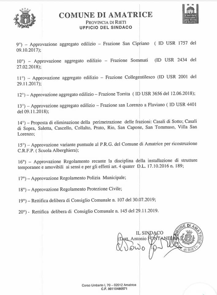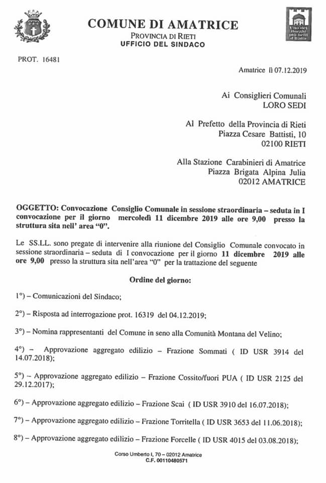 Convocato il Consiglio Comunale di Amatrice per domani (mercoledì 11 dicembre 2019) alle ore 09:00 presso la struttura sita in “Campo 0”.