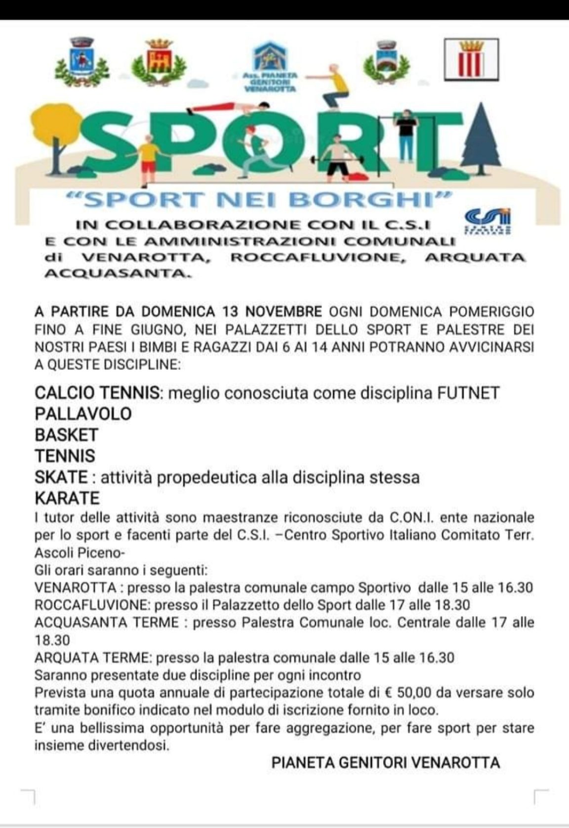 Iniziativa promossa dall’associazione Pianeta Genitori Venarotta, dal CSI Ascoli Piceno e dalle amministrazioni comunali per l’apprendimento di altri sport diversi dai corsi già presenti tenuti sul nostro territorio.