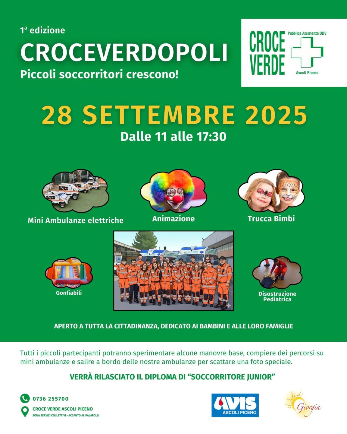 Condividiamo questa bella iniziativa organizzata dalla Croce Verde di Ascoli Piceno che si terrà Domenica 28 settembre 2025 dalle 11:00 alle 17:30 presso la Sede Croce Verde Ascoli Piceno – Zona servizi collettivi, accanto al Palafolli.