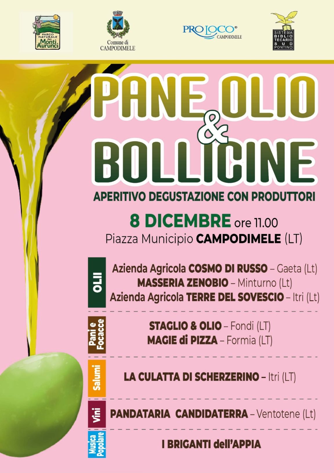 L’Amministrazione comunale di Campodimele informa che l’8 dicembre, alle ore 11.00, in Piazza Municipio, si terrà l’evento “Pane, Olio & Bollicine”, una mattinata dedicata alla promozione delle eccellenze agroalimentari del territorio e alla valorizzazione della filiera locale.