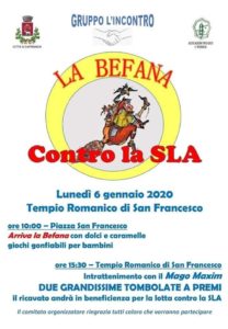 Come ogni anno si tratta di una “Befana Solidale”, organizzata dal Gruppo L’incontro, in cui il ricavato delle tombole e delle lotterie andrà in beneficenza per la lotta contro la SLA.