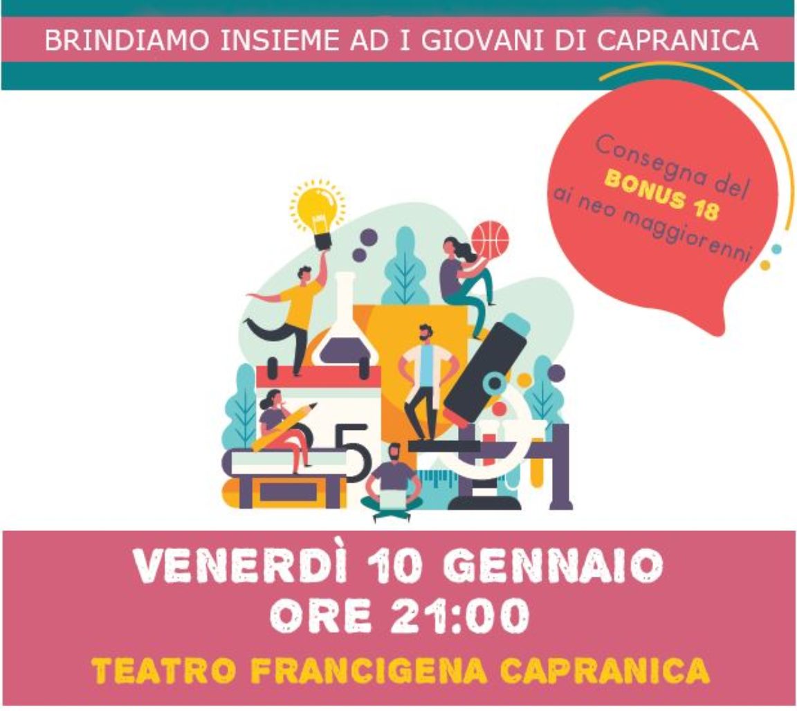 - I ragazzi che hanno compiuto 18 anni nel 2019, con i quali vogliamo brindare insieme al futuro e ad alle responsabilità che li aspettano come cittadini italiani. Per questo faremo loro dono della Costituzione Italiana, che possa guidarli sempre nelle loro scelte di vita seguendo i principi più alti della nostra Repubblica Italiana, ed un Bonus18 che possa essere un piccolo contributo alle attività sociali dei ragazzi, ottenuto grazie ad un finanziamento della Regione Lazio.