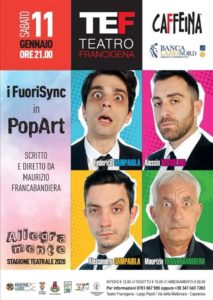 Si inaugura questa sera, alle ore 21, al TEATRO FRANCIGENA di CAPRANICA la stagione teatrale 2020 “Allegramente” con lo spettacolo dei FuorSync “PopArt”. PopArt è “un susseguirsi caleidoscopico di gag dove i FuoriSync si cimenteranno nella reinterpretazione di famose scene di film e pezzi cult della televisione che tutti ricordiamo, tutto legato da monologhi innovativi ed esilaranti.
