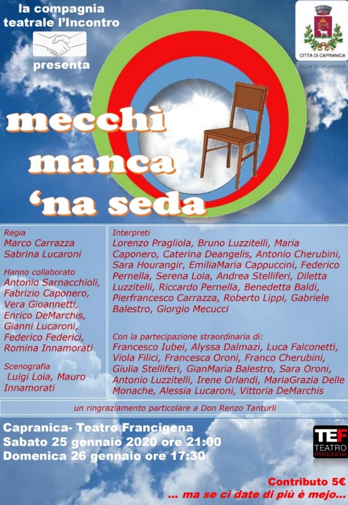 Va in scena questa sera, ore 21.00, al Teatro Francigena di Capranica, la prima dello spettacolo “Mecchì manca ‘na seda” del gruppo teatrale “L’Incontro”.