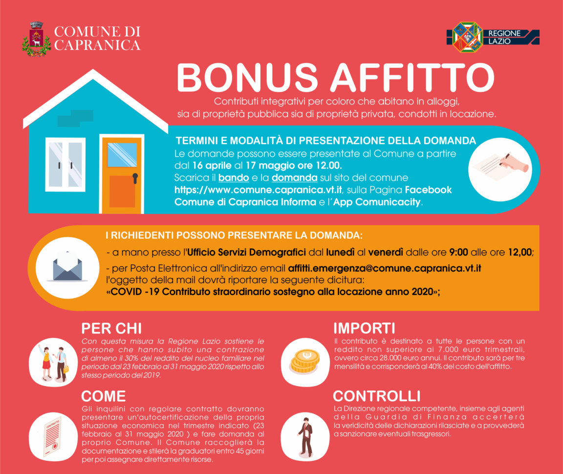 A seguito dell’emergenza sanitaria COVID-19 che sta determinando evidenti difficoltà economiche e sociali soprattutto per le famiglie più fragili, la Regione Lazio, con proprie risorse, ha previsto un apposito stanziamento straordinario una tantum, finalizzato alla concessione di contributi in favore di conduttori di alloggi per sostenere in parte il pagamento dei canoni di locazione su alloggi di proprietà sia privata sia pubblica per tre mensilità dell’anno 2020.