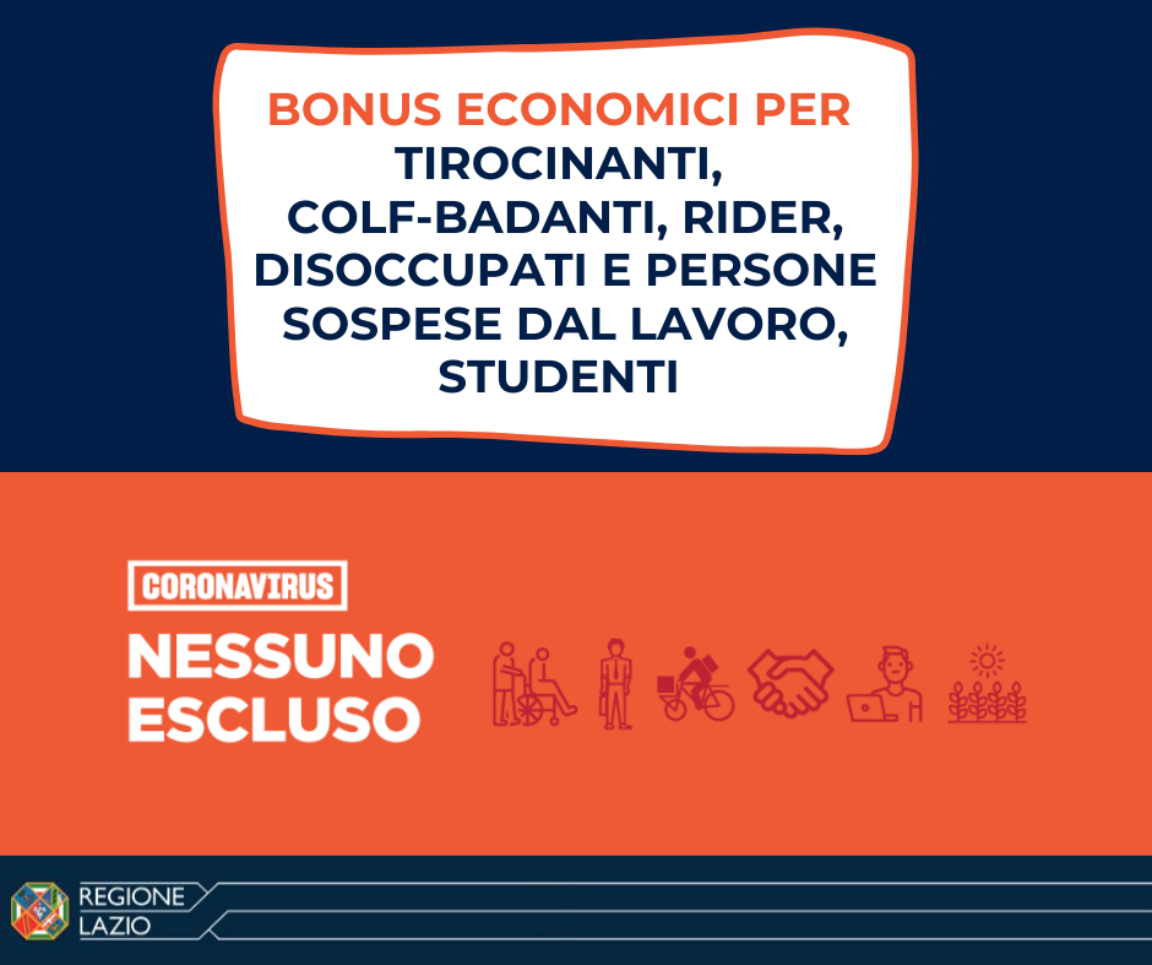 - Bonus disoccupati e sospesi dal lavoro. 600 euro come contributo per persone in stato di disoccupazione o sospensione dal lavoro che non percepiscano altra forma di sostegno al reddito (ammortizzatori sociali, reddito di cittadinanza). Investimento complessivo: €24.000.000. Le domande possono essere presentate attraverso la piattaforma generazioniemergenza.laziodisco.it dal 7 maggio.