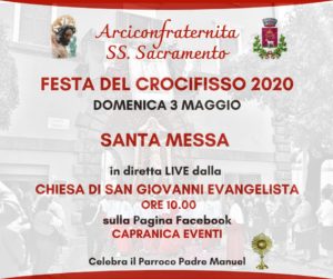 Domani, domenica 3 maggio alle ore 10.00, in diretta facebook sulla pagina “Capranica Eventi” verrà trasmessa la diretta della Santa Messa della festa del Crocifisso, celebrata da Padre Manuel.