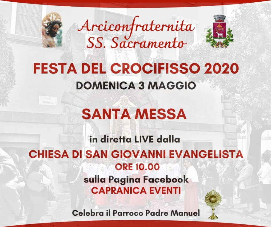 Domani, domenica 3 maggio alle ore 10.00, in diretta facebook sulla pagina “Capranica Eventi” verrà trasmessa la diretta della Santa Messa della festa del Crocifisso, celebrata da Padre Manuel.