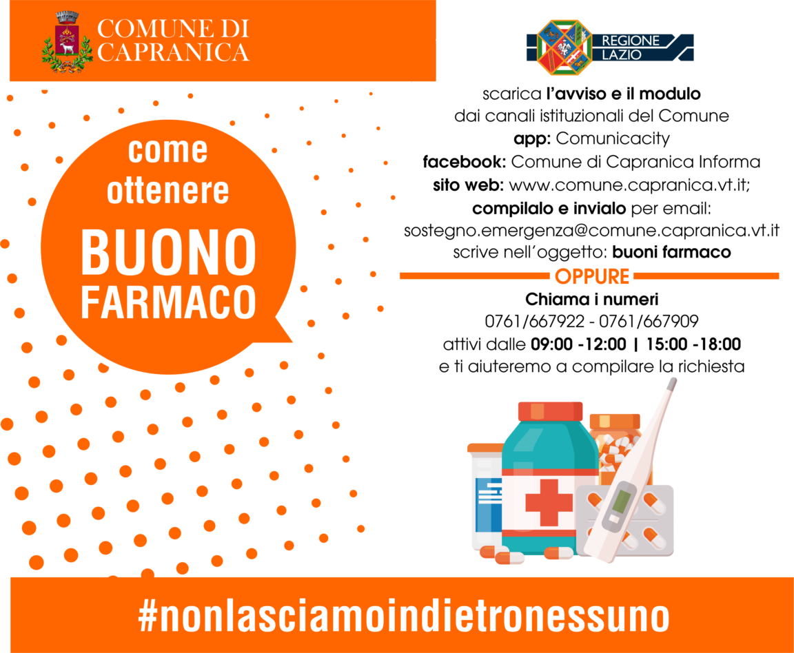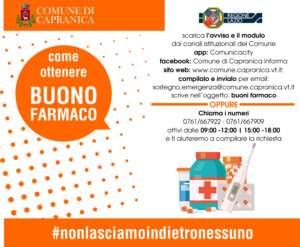 Si informa che da oggi, per le persone e le famiglie in condizioni di difficoltà a seguito delle ripercussioni economiche connesse alle misure di contenimento per il Covid-19, è possibile accedere all’erogazione straordinaria di buoni per l’acquisto dei farmaci.