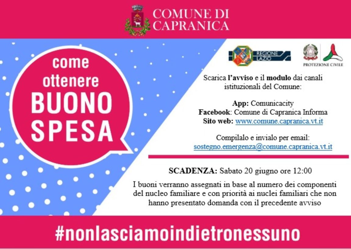 Questa amministrazione Comunale, considerando l’emergenza sanitaria determinata dalla diffusione del Virus Covid-19 e le ripercussioni economiche connesse alle misure di contenimento, intende procedere ad una nuova assegnazione di buoni spesa .