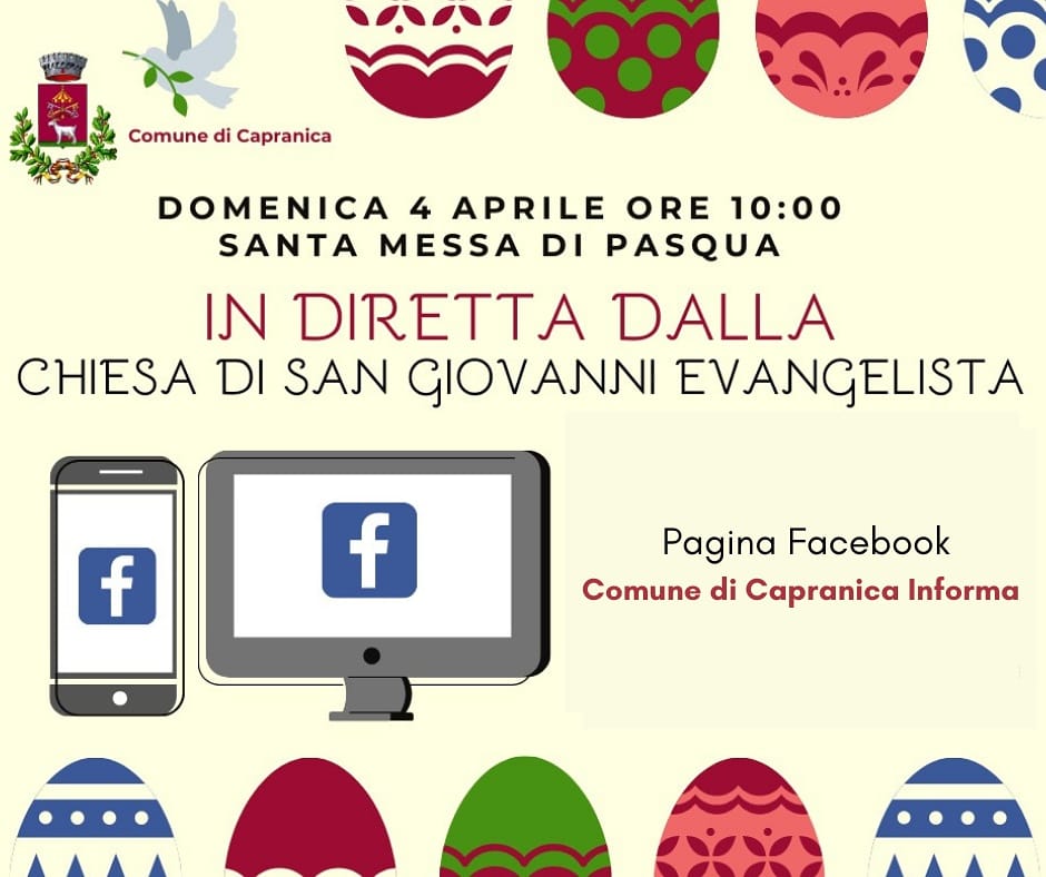 Domani, DOMENICA 4 APRILE ALLE ORE 10.00, verrà trasmessa la Santa Messa di Pasqua in diretta streaming dalla Pagina Facebook di Comune di Capranica Informa.