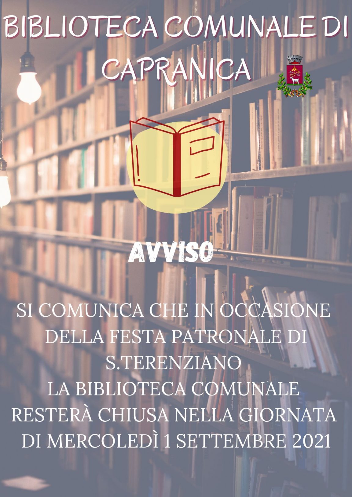 Si comunica che la biblioteca comunale di Capranica resterà chiusa mercoledì 1 settembre 2021 in occasione della festa patronale.