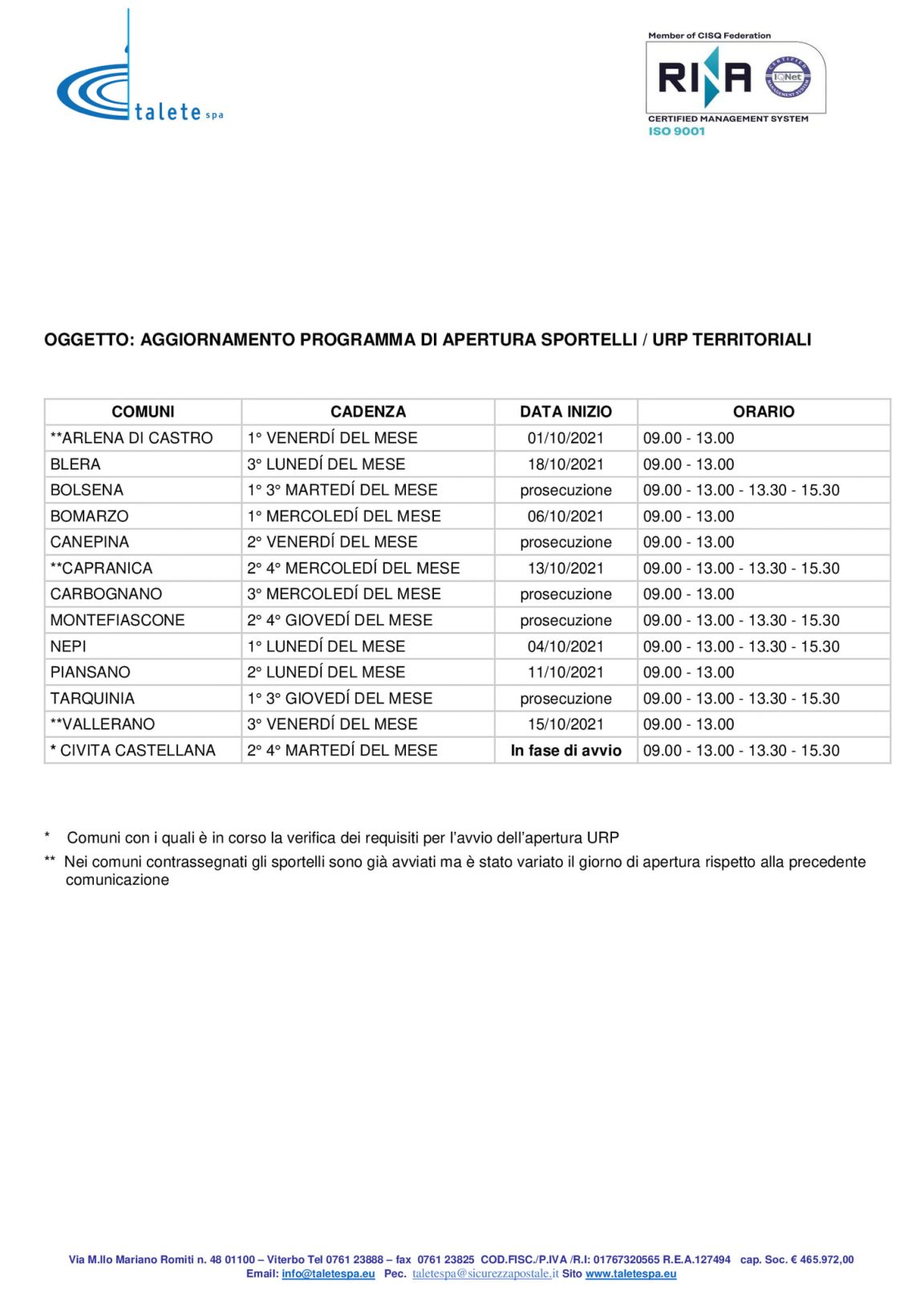 SPORTELLO TALETE: PROGRAMMA APERTURE
