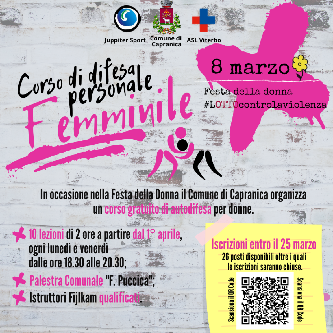 Il Comune di Capranica, in collaborazione con l’ASD Juppiter Sport, promuove la realizzazione di un corso gratuito di autodifesa femminile.