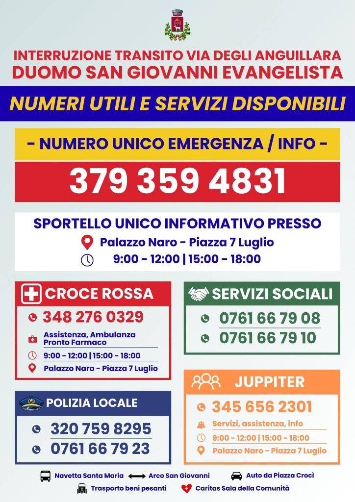 A seguito dellโOrdinanza n. 13 del 09/02/2026, dopo il crollo di una parte del tetto del Duomo di San Giovanni Evangelista e la chiusura di via degli Anguillara, sono state attivate diverse misure di supporto per ridurre i disagi ai residenti.