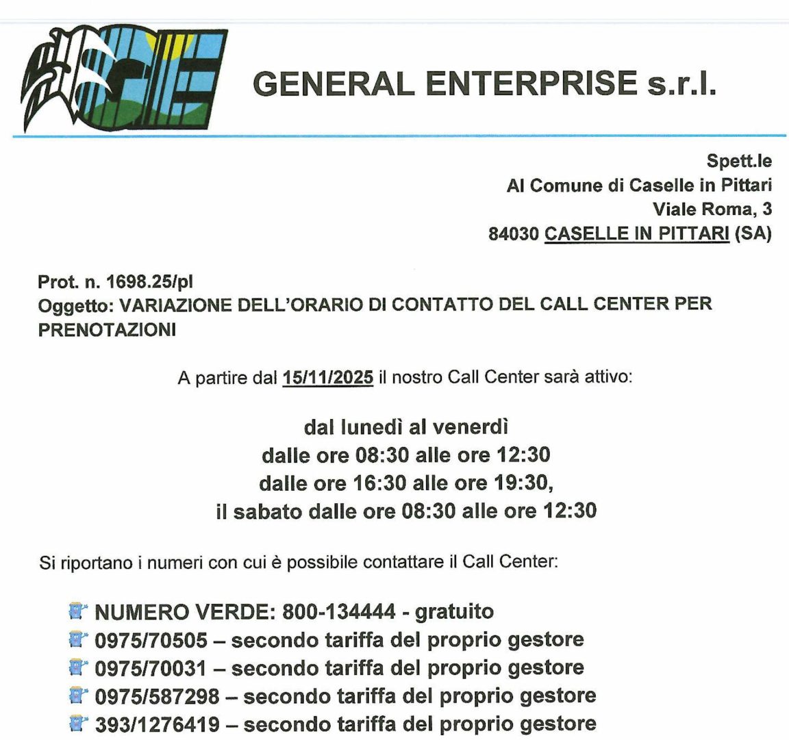 Dal 15 Novembre 2025 sarà attivo il nuovo orario del Call Center della Società General Enterprise che gestisce il servizio della raccolta differenziata dei rifiuti urbani, per prenotare lo smaltimento degli ingombranti presso l’isola ecologica