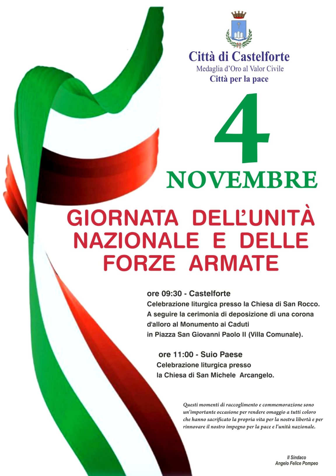 Solenni celebrazioni in ricordo della Giornata dell’Unità Nazionale e delle Forze Armate, che si terranno a Castelforte e Suio Paese il 4 novembre. A Castelforte, ore 09:30, celebrazione liturgica presso la Chiesa di San Rocco. A seguire la cerimonia di deposizione di una corona d’alloro al Monumento ai Caduti in Piazza San Giovanni II (Villa Comunale). A Suio Paese, ore 11:00, celebrazione liturgica presso la Chiesa di San Michele Arcangelo.