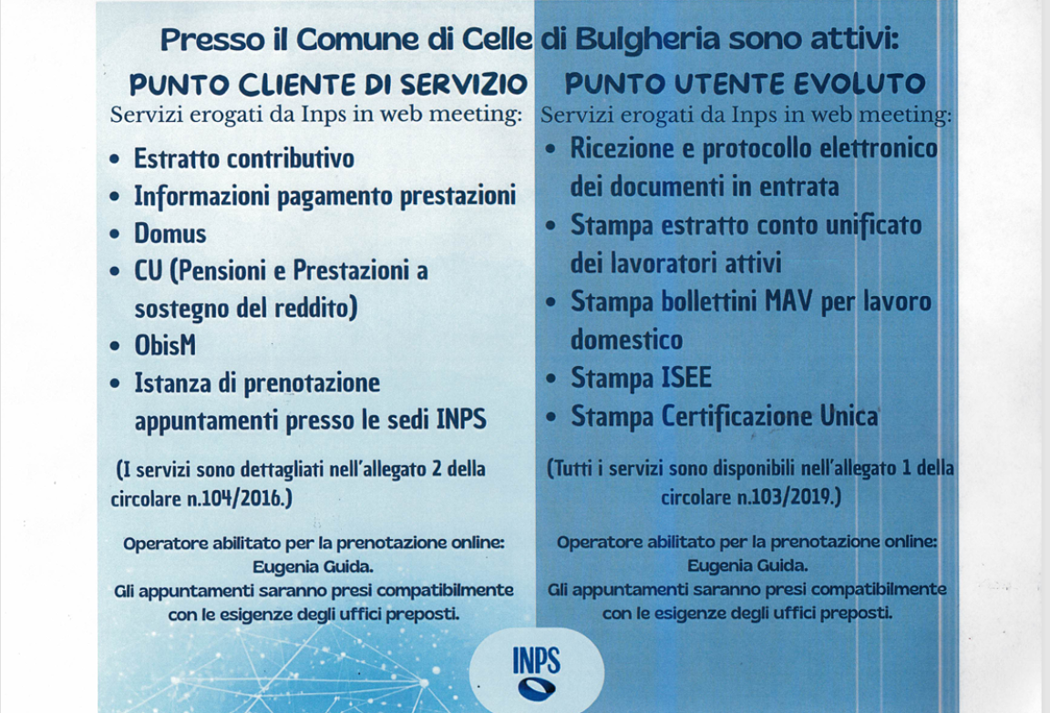 A Celle di Bulgheria, sono attivi i punti INPS (Cliente e Utente Evoluto). Servizi: estratti, CU, ISEE, MAV. Feriali (no giovedì), solo su appuntamento.