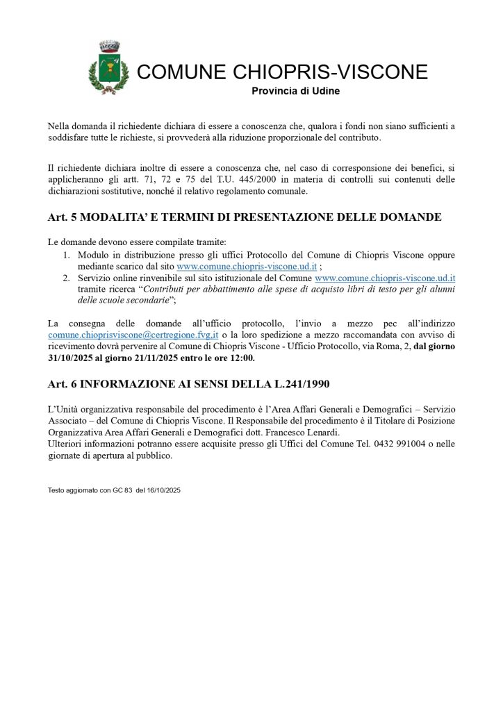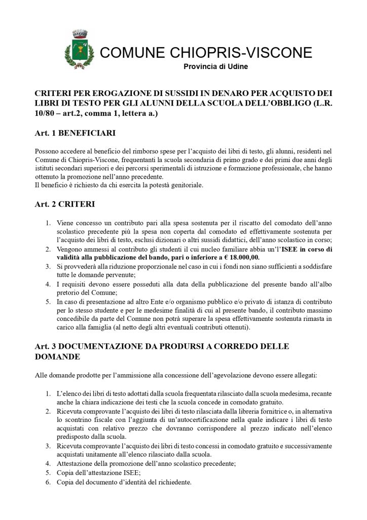 EROGAZIONE DI SUSSIDI IN DENARO PER ACQUISTO DEI LIBRI DI TESTO PER GLI ALUNNI DELLA SCUOLA DELL’OBBLIGO 31 Ottobre 2025 📎 AllegatiBANDO ANNO 2025 schema per richiesta contributo libri