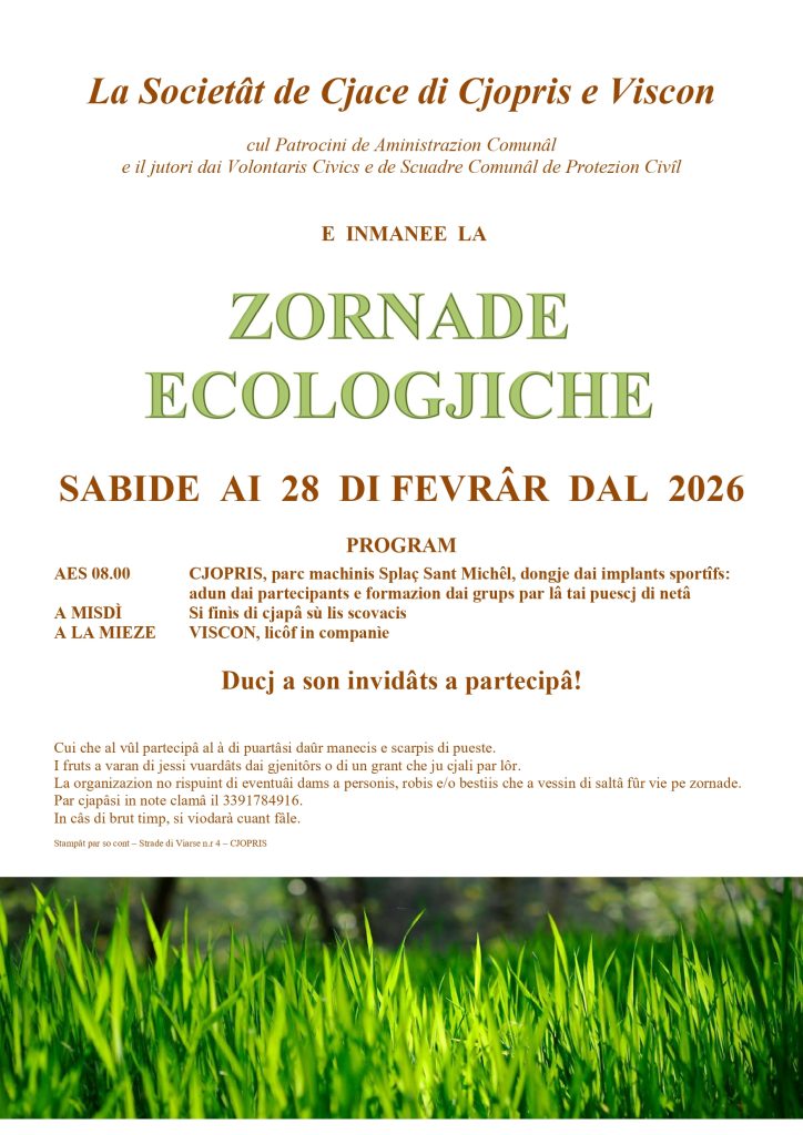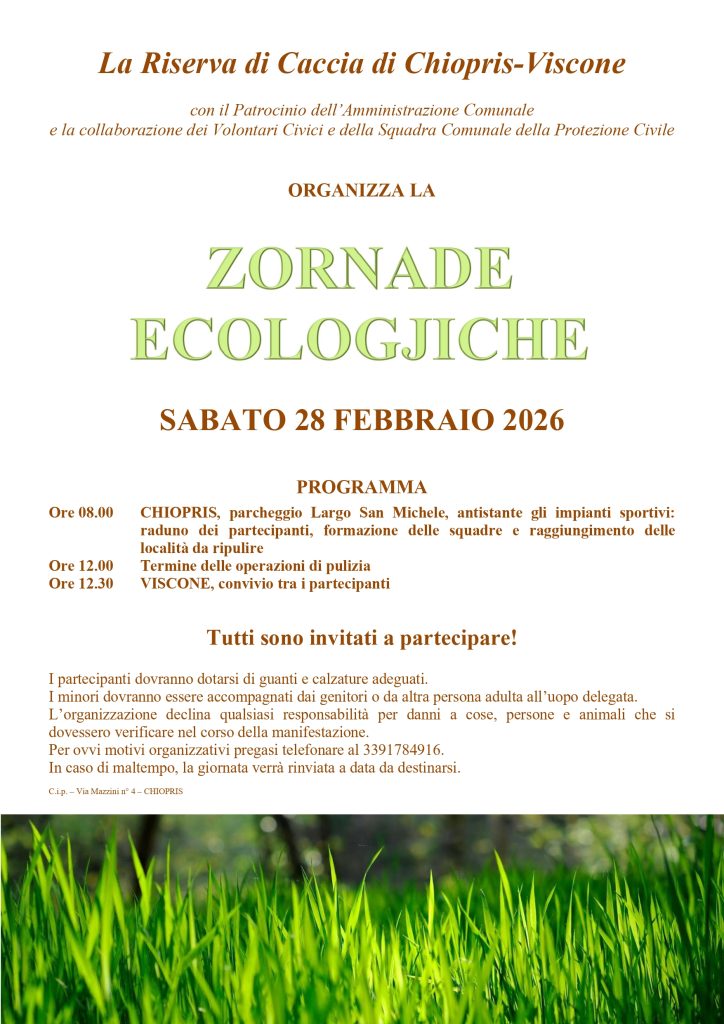 La Riserva di Caccia di Chiopris-Viscone informa che la Zornade Ecologiche, prevista per Sabato 8 Febbraio, viene rimandata per meteo avverso a Sabato 28 Febbraio 2026 ore 08.00