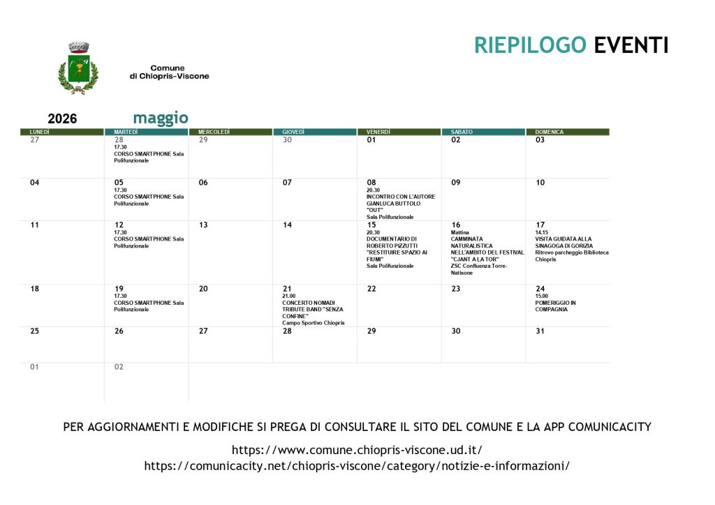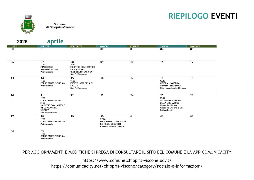 Riepilogo eventi dei mesi di Aprile e Maggio 2026 31 Marzo 2026 📎 AllegatiChiopris Viscone Corso di Smartphone 2026