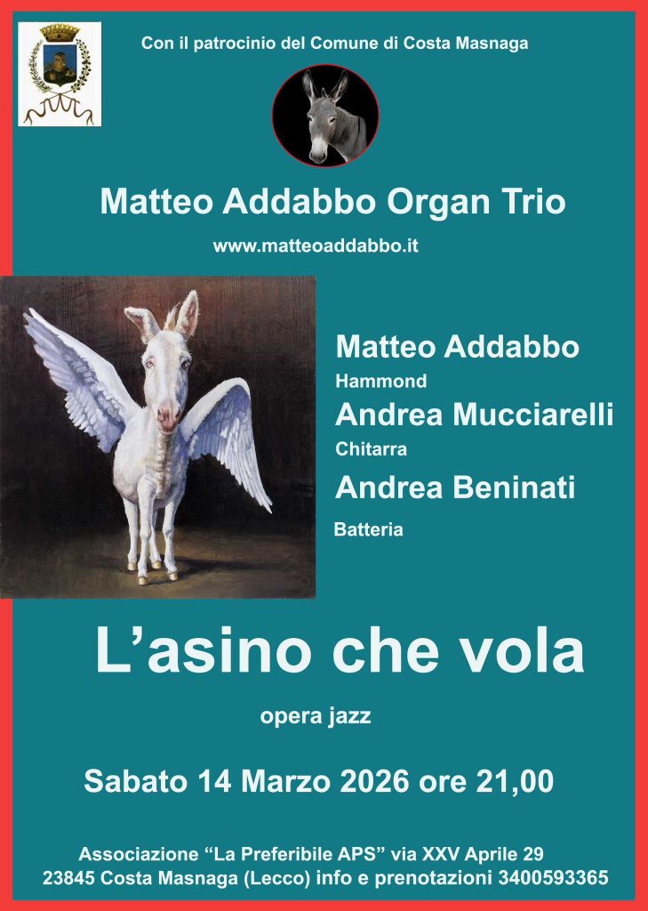Sabato 14 marzo l’associazione “La Preferibile APS ” di Costa Masnaga, con il patrocinio del Comune di Costa Masnaga, ospita tre grandi musicisti provenienti da Siena. Gli artisti suoneranno brani di loro composizione inseriti nell’ultimo loro album intitolato appunto ” L’asino che vola”. Sappiamo quanto questa associazione ama l’animale, avendo messo sul balcone all’ingresso, un asino in resina a grandezza naturale.