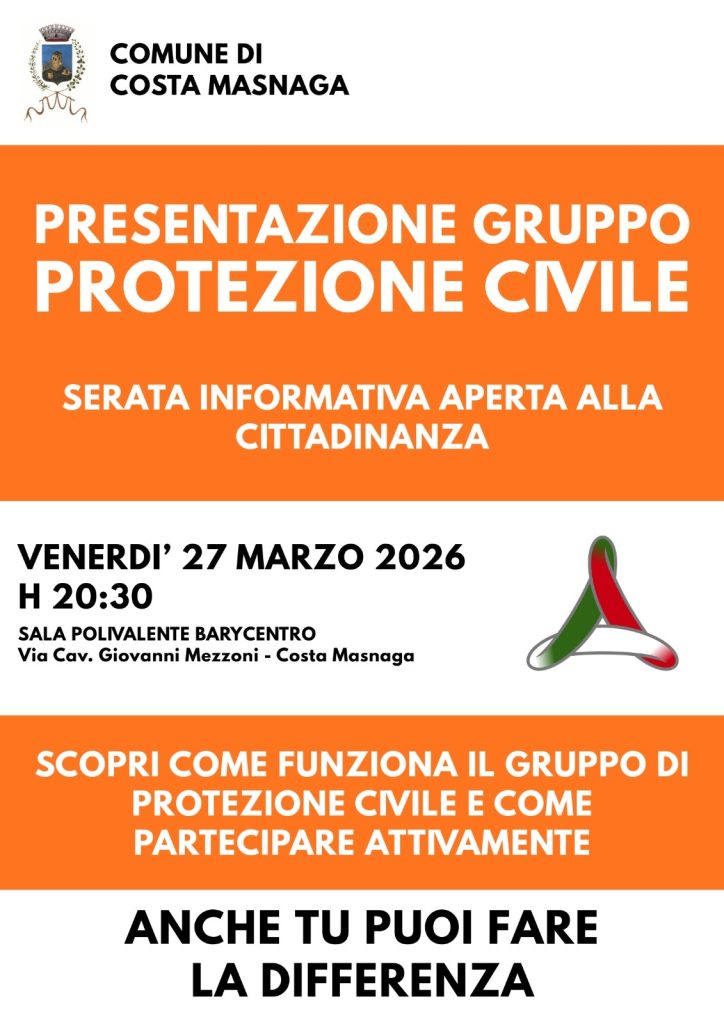 Vuoi entrare nel gruppo di protezione civile del comune? Vieni a capire come si fa venerdì 27 alle 20.30 alla sala polivalente del Barycentro”. TI ASPETTIAMO