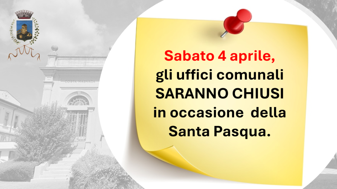 Si comunica che il giorno 4.4.2026, in occasione della S. Pasqua, gli uffici comunali resteranno chiusi