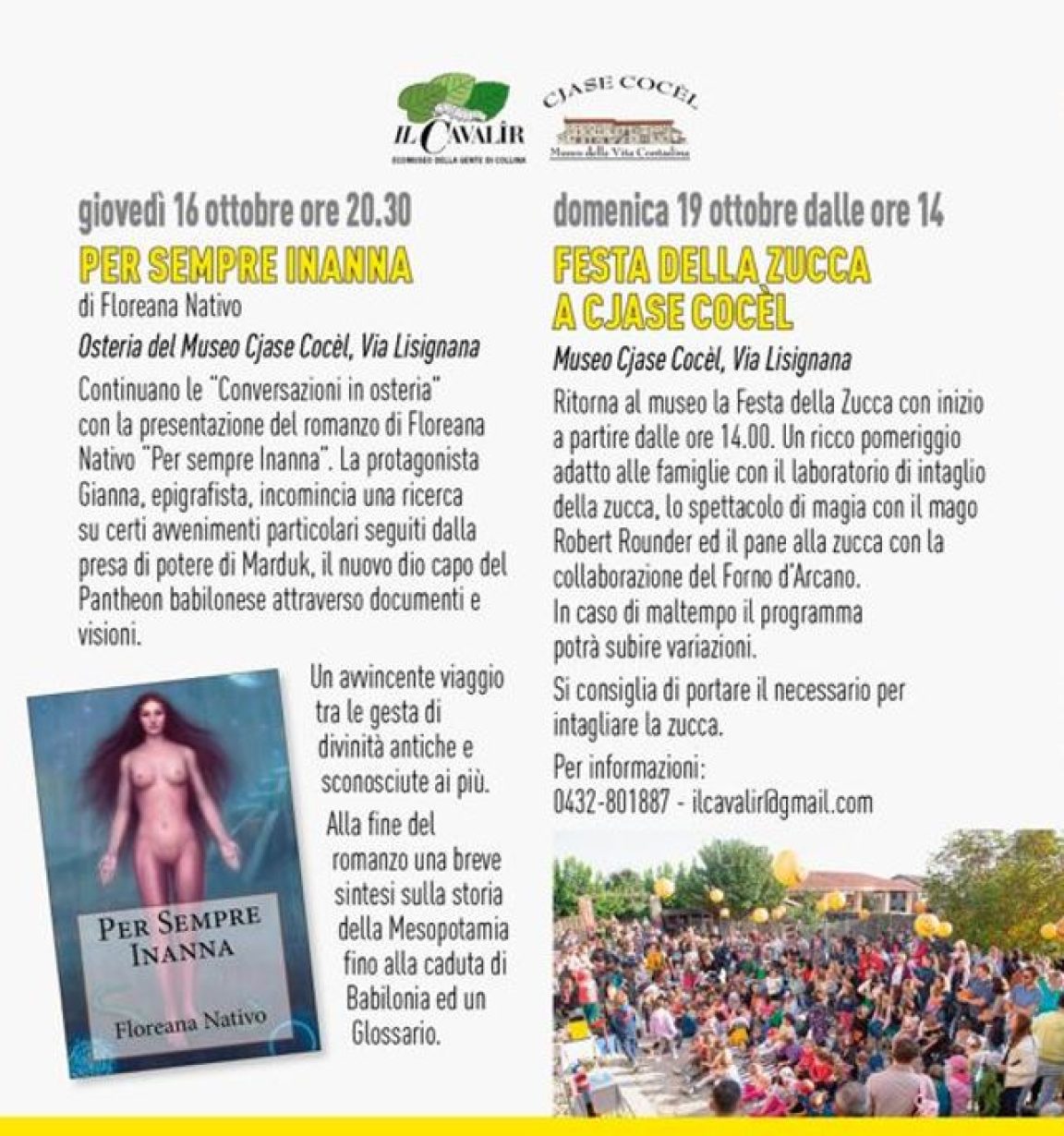 Continuano gli appuntamenti letterari presso l’Osteria di Cjase Cocel: giovedì 16 ottobre Floreana Nativo presenta il suo romanzo “Per sempre Inanna”. Appuntamento alle ore 20.30. Ingresso libero.