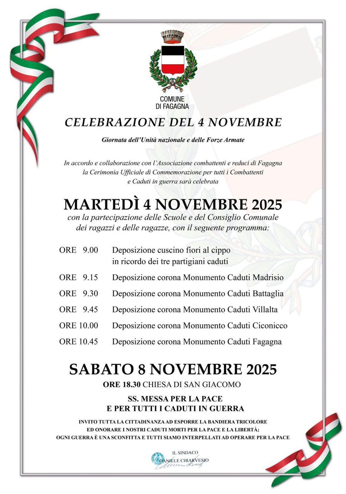 In occasione della celebrazione della festa del 4 novembre, sabato 8 novembre alle ore 18.30 presso la chiesa di San Giacomo in Fagagna sarà celebrata una messa per la pace e per i caduti di tutte le guerre