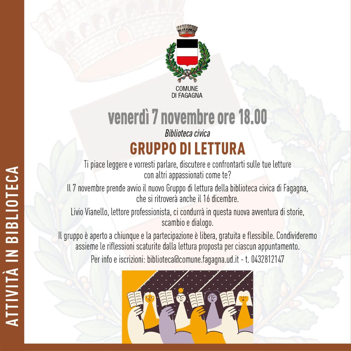 Incontro con Livio Vianello, lettore professionista, venerdì 7 novembre alle ore 18.00. Info e prenotazioni in Biblioteca comunale.