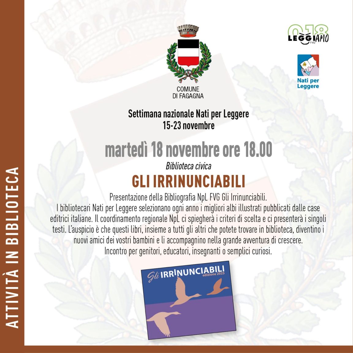 Presentazione della bibliografia NPL “Gli irrinunciabili”, giovedì 18 novembre alle 18 in Biblioteca.
