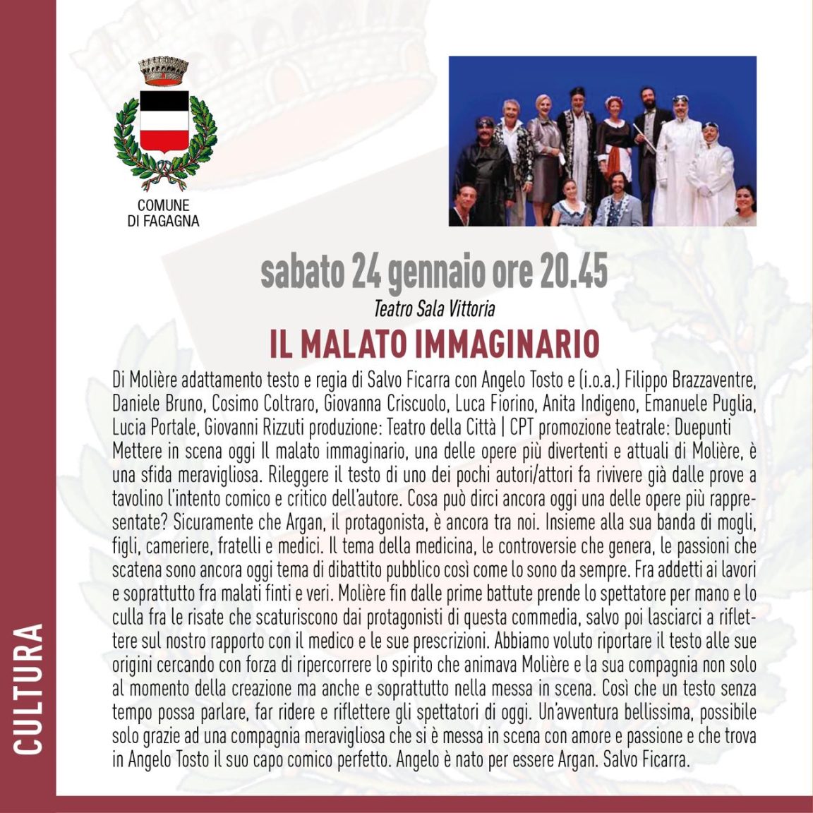 Presso Sala Vittoria di Fagagna, sabato 24 gennaio alle ore 20.45 va in segna “Malato Immaginario” da Molière con adattamento, testo e regia di Salvo Ficarra