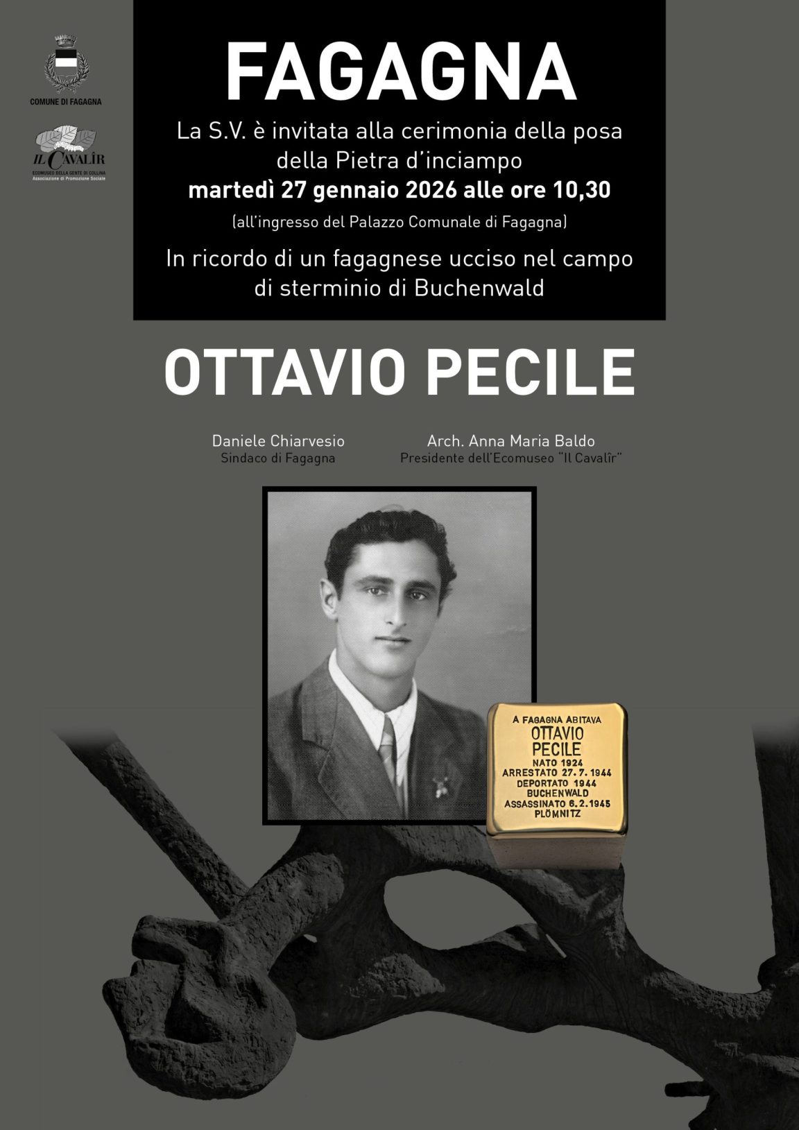 In occasione della Giornata della Memoria, martedì 27 gennaio alle ore 10.30 all’ingresso del Palazzo Municipale si terrà la cerimonia della posa della pietra d’inciampo in memoria di Ottavio Pecile, fagagnese ucciso nel campo di sterminio di Buchenwald.