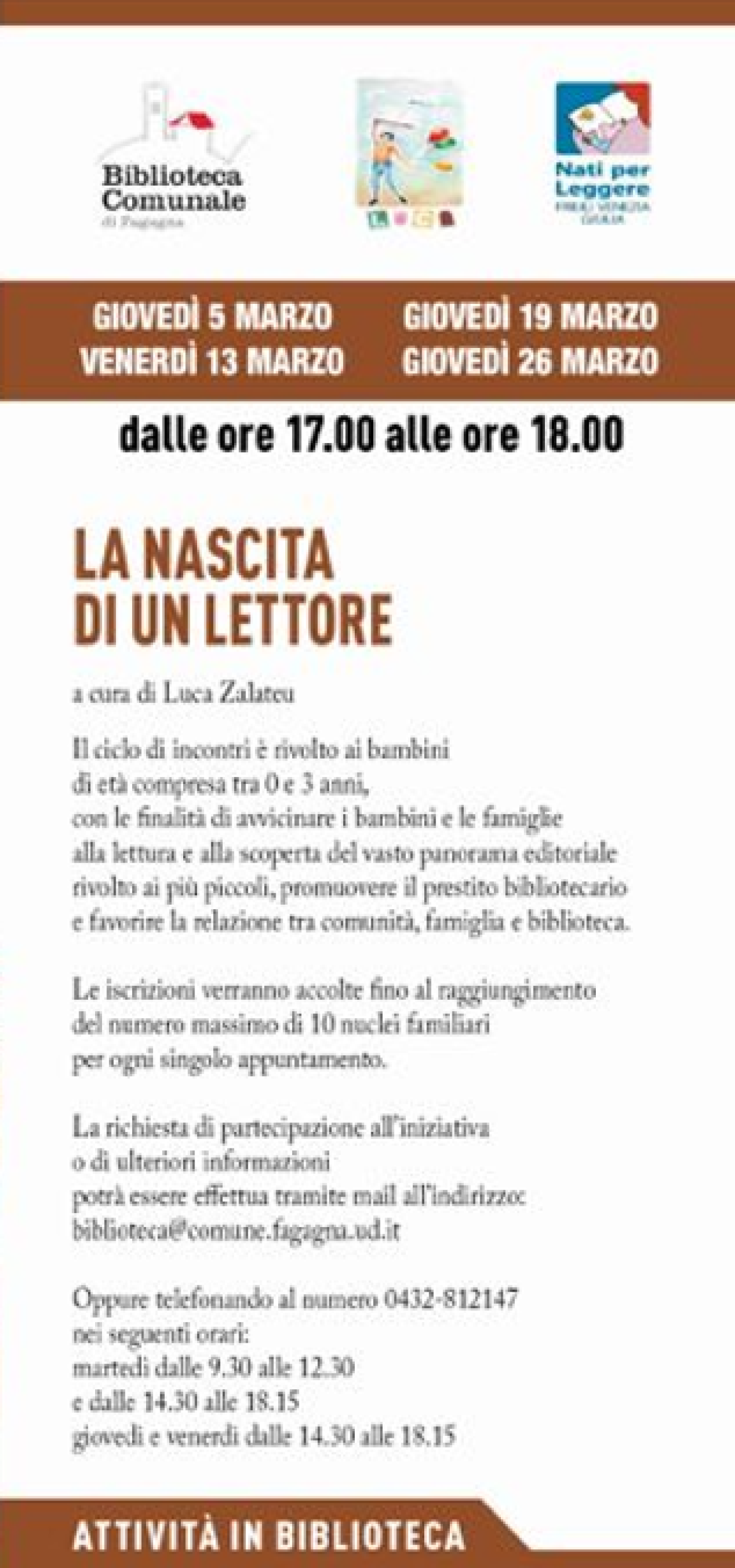 Info e iscrizioni in biblioteca: biblioteca@comune.fagagna.ud.it e tel 0432812147