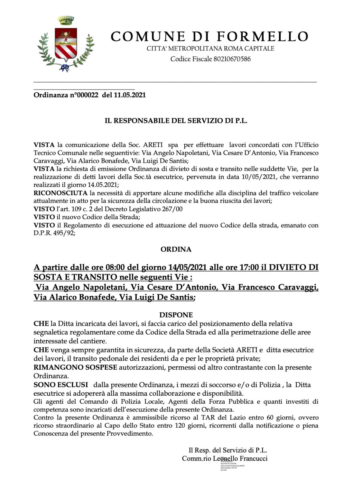Via Angelo Napoletani, Via Cesare D’Antonio, Via Francesco Caravaggi, Via Alarico Bonafede, Via Luigi De Santis, in quanto la Soc. ARETI spa deve effettuare lavori concordati con l’Ufficio Tecnico Comunale. La Ditta incaricata dei lavori, si farà carico del posizionamento della relativa segnaletica regolamentare come da Codice della Strada ed alla perimetrazione delle aree interessate del cantiere.