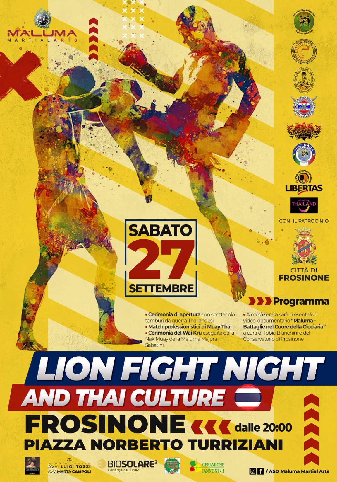 Sabato 27 settembre 2025, alle ore 20, Piazza Norberto Turriziani si trasformerà in un’arena a cielo aperto per ospitare la “Lion Fight Night”, il galà dedicato agli sport da combattimento e ai giovani atleti di Muay Thai organizzato da Maluma con il patrocinio del Comune di Frosinone (assessorato all’ambiente del vicesindaco Antonio Scaccia; assessorato al centro storico di Rossella Testa; consigliere delegato allo sport Franco Carfagna).