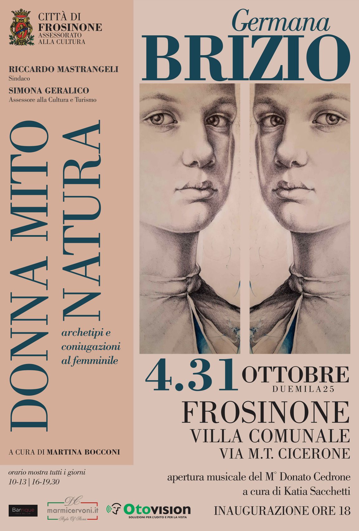 Dal 4 al 31 ottobre 2025 la Villa comunale di Frosinone ospiterà la mostra “Donna Mito Natura” dell’artista Germana Brizio, a cura di Martina Bocconi e patrocinata dal Comune di Frosinone mediante l’assessorato alla cultura e turismo guidato da Simona Geralico.