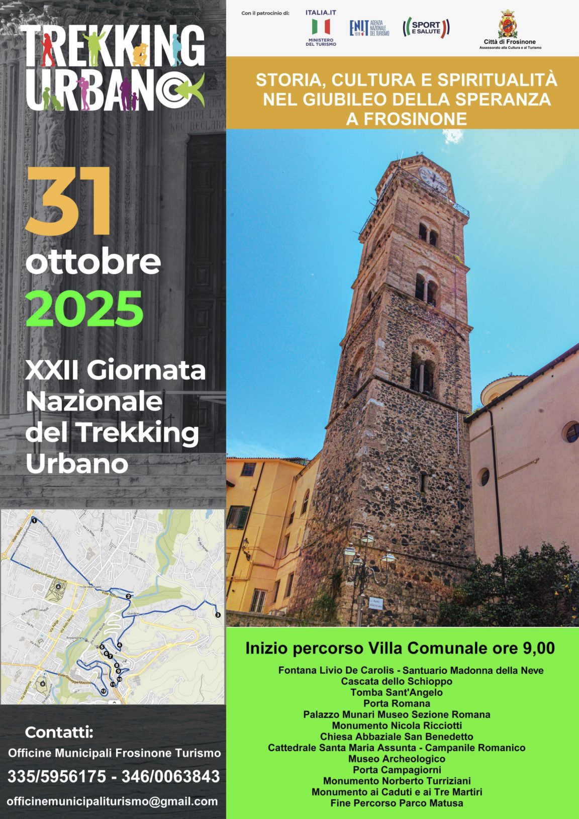 Anche Frosinone tra le 85 città partecipanti, il prossimo venerdì 31 ottobre, alla giornata nazionale del trekking urbano. L’iniziativa, nata 22 anni fa a Siena, capofila del progetto, è realizzata a Frosinone con il patrocinio del Comune, assessorato a cultura e turismo di Simona Geralico.