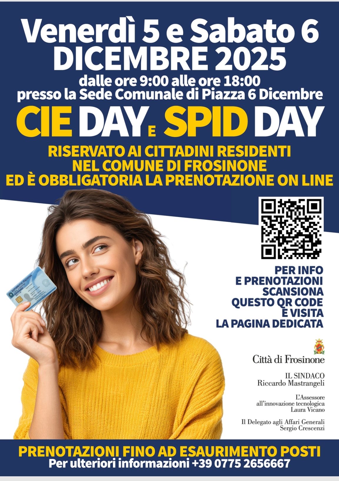 L’amministrazione comunale, su indirizzo del Sindaco Riccardo Mastrangeli, di concerto con l’assessore all’innovazione tecnologica Laura Vicano e con il consigliere delegato Sergio Crescenzi, ha istituito, per venerdì 5 e sabato 6 dicembre dalle 9 alle 18, presso la sede comunale di piazza VI dicembre, l’Open Day per il rinnovo della carta di identità elettronica e per il rilascio dello Spid. L’iniziativa è riservata esclusivamente ai cittadini residenti nel Comune di Frosinone. Le prenotazioni saranno aperte da venerdì 28 novembre alle 16. La partecipazione è possibile solo tramite prenotazione online sul sito istituzionale dell’Ente, al link https://servizionlinepa.it/frosinone/openday/. La prenotazione è nominativa e consente di prenotare una sola persona per volta (anche nel caso di minorenni); per svolgere entrambi i servizi (CIE e SPID) è necessario effettuare due prenotazioni distinte (a orari diversi). Il costo della CIE è di 22,50 euro mentre il rilascio dello SPID è gratuito. Per la CIE, sarà necessario portare con sé fototessera, codice fiscale, tessera sanitaria, carta di identità scaduta o prossima alla scadenza o denuncia di smarrimento; in caso di minori di anni 18, è necessaria la presenza di entrambi i genitori (muniti di apposito documento di identità) o di un genitore con apposita delega e copia di un documento di identità del genitore assente. Per lo Spid, sono richiesti documento di identità, codice fiscale, posta elettronica personale e smartphone corrispondente al numero di cellulare che si vorrà associare allo SPID. Prenotazioni fino a esaurimento posti. Per informazioni: 0775/2656667.