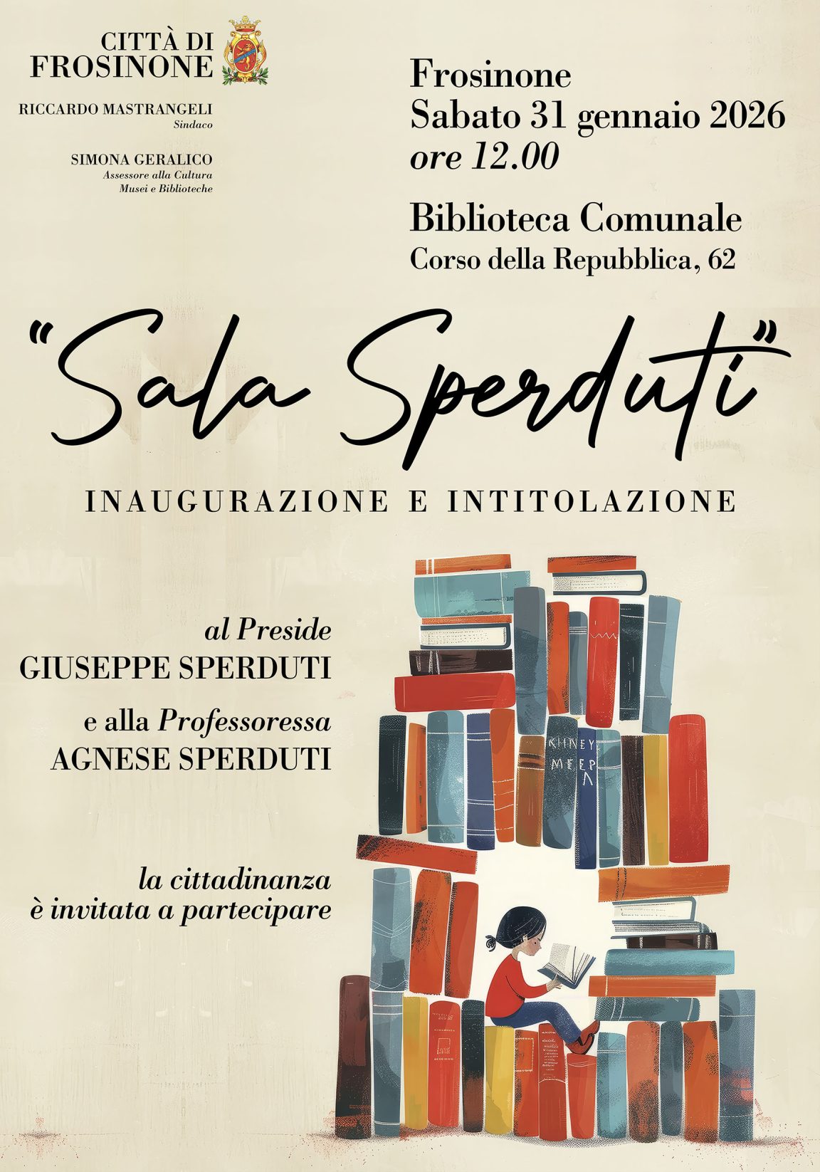 Sabato 31 gennaio, alle ore 12, si terrà la cerimonia di inaugurazione della nuova sala posta al piano terra della Biblioteca comunale “Turriziani”, che sarà intitolata – come voluto dall’Amministrazione comunale e, in particolare, dal Sindaco Riccardo Mastrangeli – a due figure di grande rilievo del territorio: Giuseppe Sperduti, già preside dell’allora Istituto magistrale di Frosinone e fondatore dell’Accademia Teretina, e Agnese Sperduti, professoressa di greco del Liceo Classico Turriziani di Frosinone e vice preside.