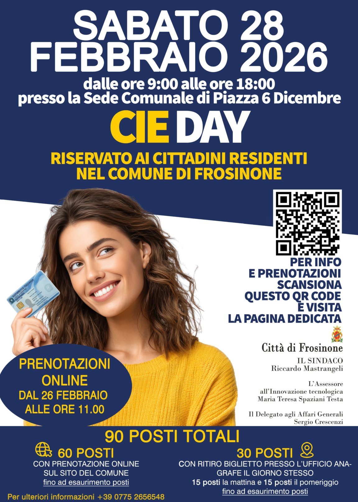 L’amministrazione comunale, su indirizzo del Sindaco Riccardo Mastrangeli, di concerto con l’assessore all’innovazione tecnologica Maria Teresa Spaziani Testa e con il consigliere delegato Sergio Crescenzi, ha istituito, per sabato 28 febbraio dalle 9 alle 18, presso la sede comunale di piazza VI dicembre, l’Open Day per il rinnovo della carta di identità elettronica. L’iniziativa, che fa seguito agli open day di dicembre e gennaio, è riservata esclusivamente ai cittadini residenti nel Comune di Frosinone. Le prenotazioni saranno aperte giovedì 26 alle 11. La partecipazione è possibile solo tramite prenotazione online sul sito istituzionale dell’Ente, al link https://servizionlinepa.it/frosinone/openday/, fino a esaurimento posti.