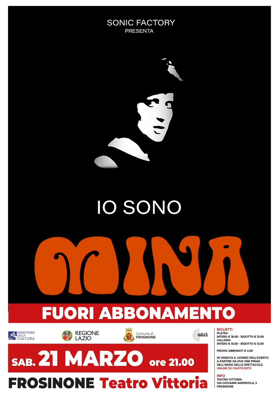 Nuovo appuntamento (fuori abbonamento) con la stagione teatrale 2025-26 al Teatro Vittoria, organizzata da Comune di Frosinone (fortemente voluta dal Sindaco Riccardo Mastrangeli con gli assessorati a cultura e centro storico, rispettivamente di Simona Geralico e Rossella Testa) e ATCL, circuito multidisciplinare del Lazio sostenuto da MIC – Ministero della Cultura e Regione Lazio. Sabato 21 marzo alle 21 andrà in scena “Io Sono Mina”, arrangiamenti Mauro Iset ed Egidio Perduca, testi Mauro Iset e Daniela Placci. Lo spettacolo musicale-teatrale è interamente dedicato alla più celebre cantante pop italiana. Diva e pop allo stesso tempo, amata da compositori, registi, musicisti e telespettatori. Dagli esordi come esponente della “tribù degli urlatori” al successo indiscusso, televisivo e discografico. Dalle celebri collaborazioni al “ritiro” dalle scene (ma non dal panorama musicale, italiano ed internazionale). Non solo una carrellata dei principali successi della “tigre di Cremona” ma, soprattutto, un viaggio nella società e nella cultura del primo dopoguerra, visto attraverso la forte personalità della popolare cantante italiana. Mina era soltanto una studentessa del quarto anno di ragioneria che si accingeva ad aiutare il padre nella gestione della sua industria, una fabbrica di colla. Viveva a Cremona con i suoi genitori, in un appartamento in cui, in ogni angolo, si avvertiva la ricchezza. Di colpo, le passò la voglia di diventare ragioniera e le prese una violenta passione per la musica leggera. Una sera, alla Bussola, in Versilia, chiese di salire sul palco: si mise a cantare come le veniva. Urlava perché ne aveva voglia. La libertà. La smania di libertà non caratterizzò solo i suoi esordi. Uno spettacolo di racconti e canzoni, trascinante e ricco di emozioni, che non mancherà di coinvolgere il pubblico. Biglietti per gli abbonati alla stagione teatrale: € 2. Platea: biglietto intero € 18, ridotto € 15; galleria: biglietto intero € 15, ridotto € 13. Biglietti presso il botteghino: il giorno dell’evento a partire da due ore prima dell’inizio dello spettacolo.