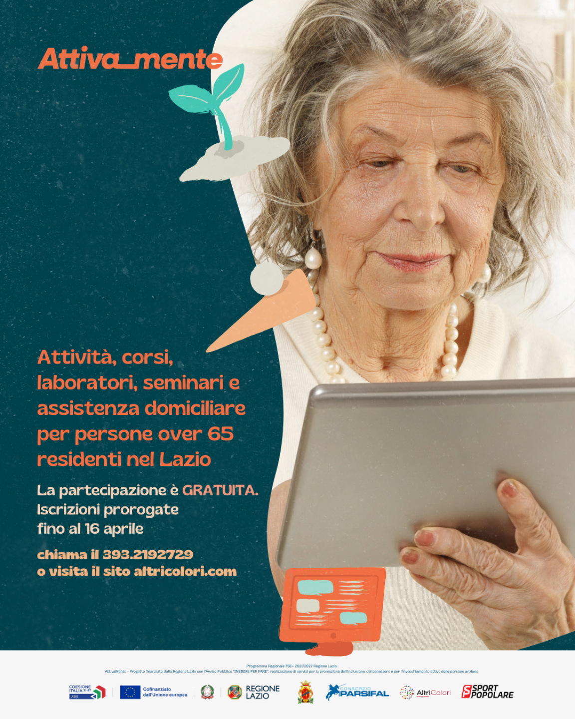 Il progetto gratuito dedicato agli over 65 pensato per promuovere il benessere, l’invecchiamento attivo e contrastare l’isolamento sociale. Contestualmente, la partecipazione è stata estesa a tutte le persone over 65 residenti nella Regione Lazio, ampliando in modo significativo la platea dei potenziali beneficiari. L’iniziativa, finanziata dalla Regione Lazio nell’ambito del Programma Regionale FSE+ 2021/2027, nasce dalla collaborazione tra Altri Colori, Consorzio Parsifal e Sport Popolare, in partenariato con il Comune di Frosinone e una rete di soggetti pubblici e privati.