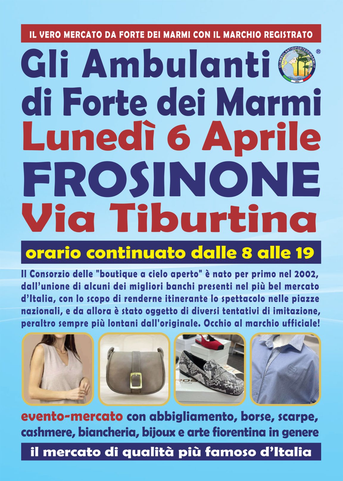 Tutto pronto per il ritorno de “Gli Ambulanti di Forte dei Marmi” in via Tiburtina a Frosinone, lunedì 6 aprile, iniziativa organizzata di concerto dal Consorzio toscano omonimo con l’associazione Piccoli mercanti e l’assessorato al commercio di Mario Grieco. Orario continuato dalle 8 alle 19, anche in caso di maltempo.