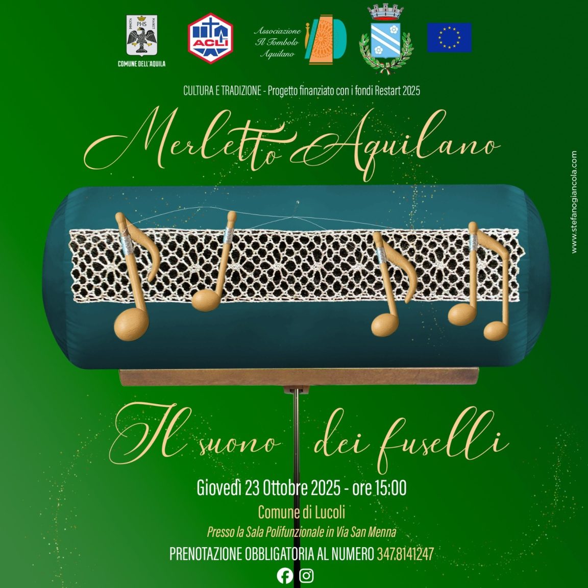 Nell’ambito del progetto Restart “Merletto Aquilano”, giovedì 23 ottobre 2025, dalle ore 15:00 alle ore 17:00, presso il Poliambulatorio in Via San Menna, si terrà l’incontro dal titolo “Il suono dei fuselli”. L’iniziativa rappresenta un momento di confronto e condivisione volto a valorizzare la tradizione e la maestria del merletto aquilano, espressione autentica dell’artigianato e del patrimonio culturale della città.