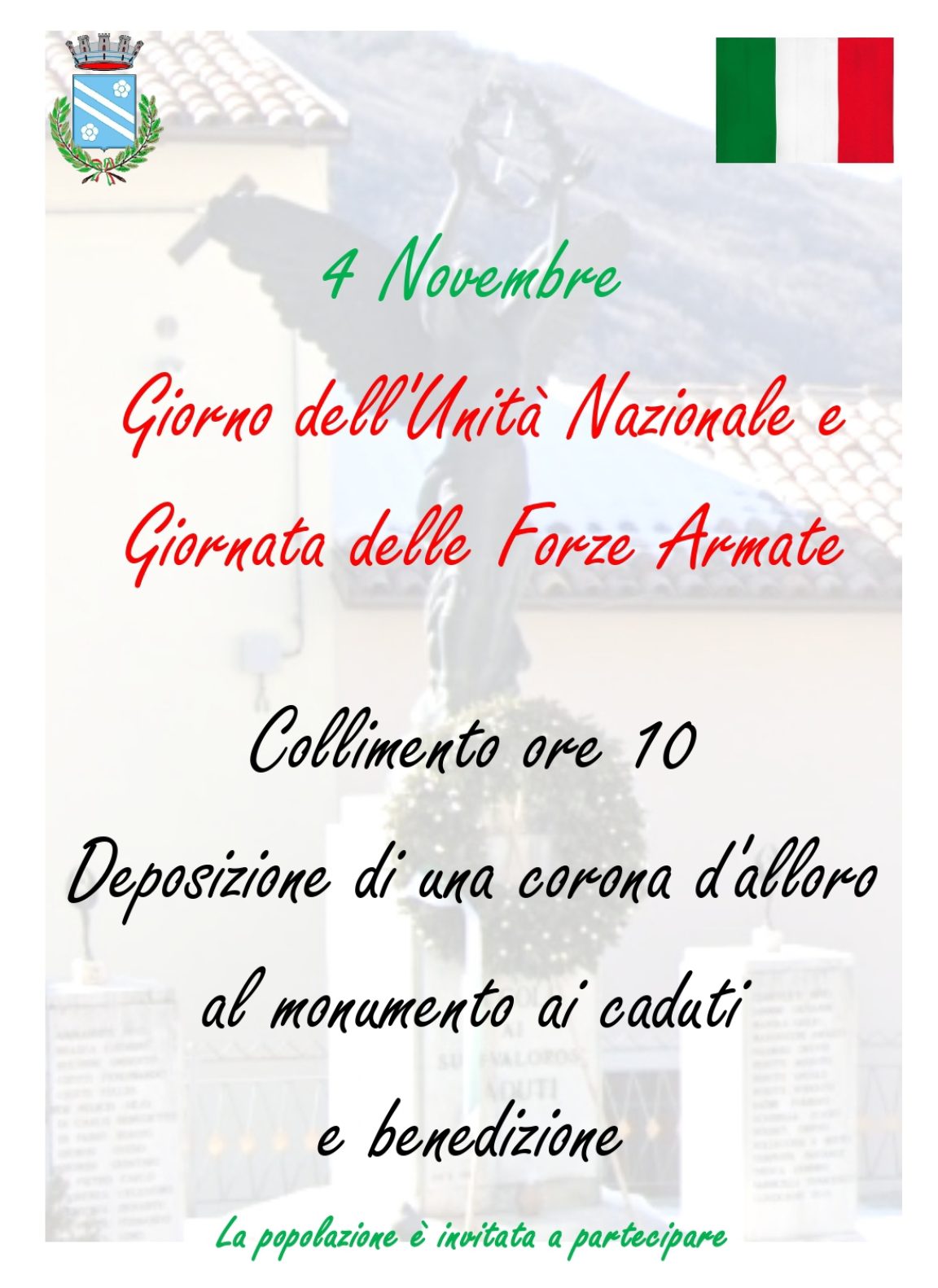 L’Amministrazione comunale invita i cittadini di Lucoli il 4 novembre alle ore 10.00 a rendere omaggio ai caduti di guerra, deponendo una corona d’alloro presso il Monumento ai caduti sito in Collimento.