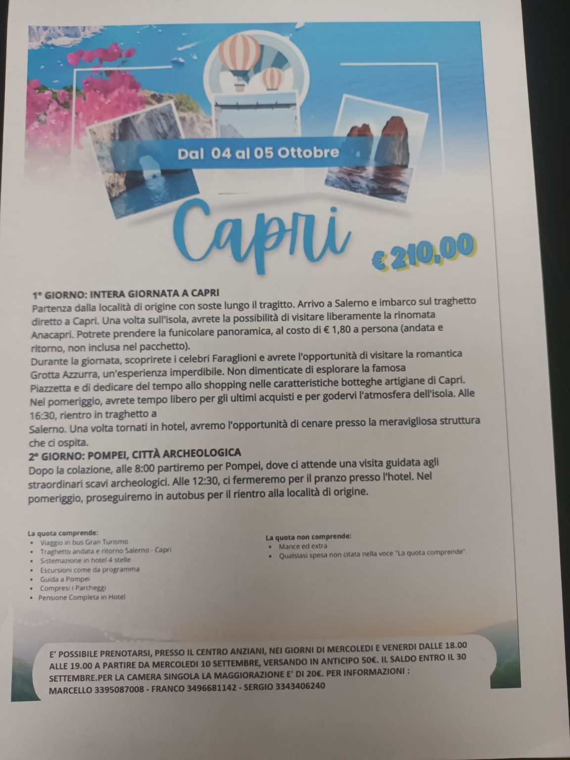 Il prossimo 4 e 5 Ottobre L’APS Centro Sociale Anziani organizza una splendida gita di due giorni alla scoperta di Capri e Pompei, tra paesaggi mozzafiato e tesori archeologici.